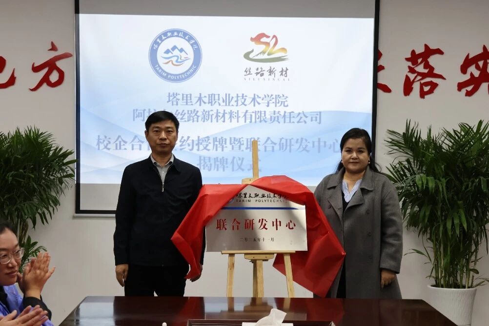 茹克亚木・如斯坦木向阿拉尔丝路新材料有限责任公司授予“产教融合人才共育基地”“实践教学基地” 牌匾,充分肯定了企业在实践教学、技能人才培养中的产业资源优势与重要支撑作用;随后,双方代表共同为“联合研发中心” 揭牌,标志着校企在技术创新、科研成果转化领域的协同合作正式启动。