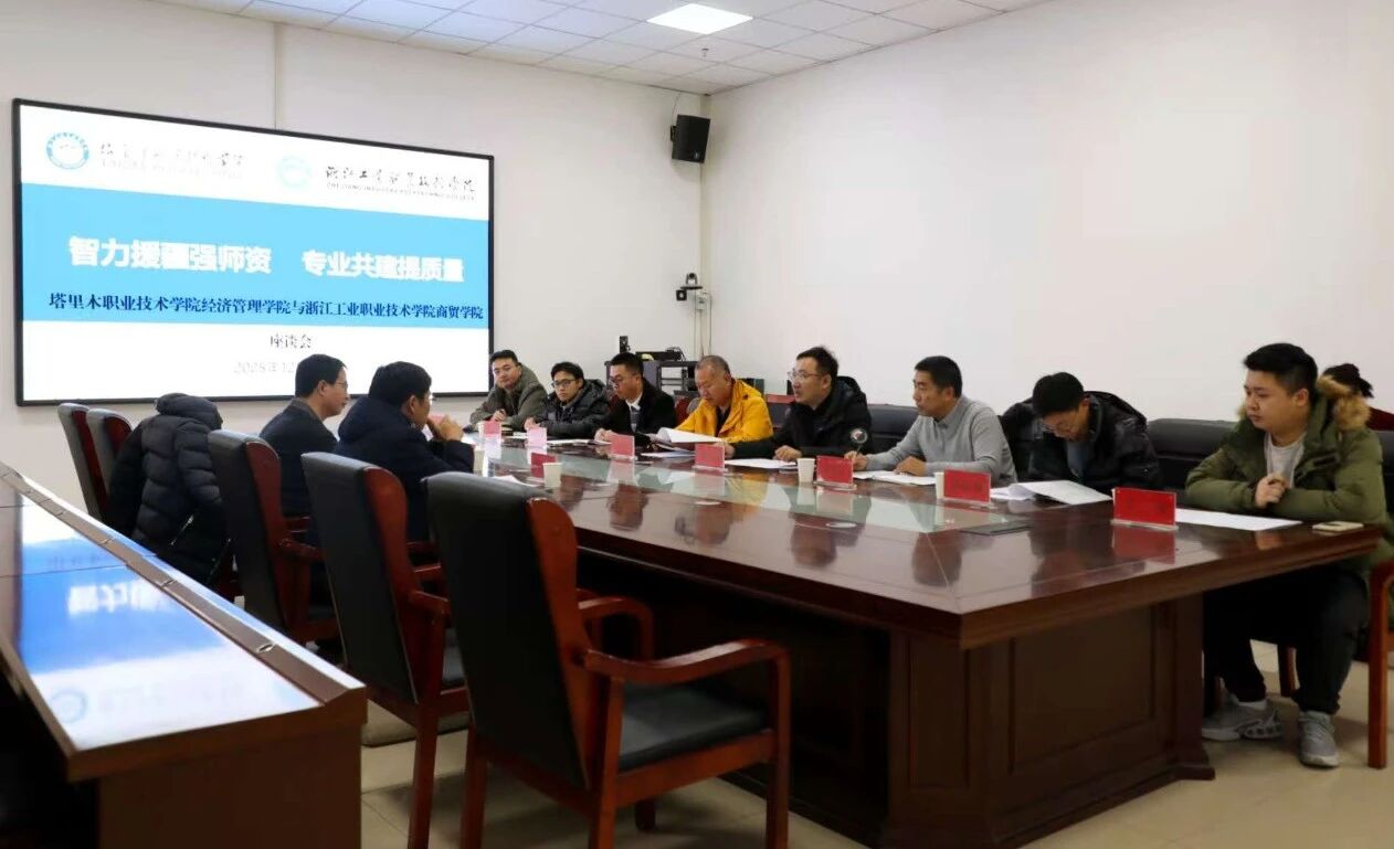 为深化对口援疆协同育人、助力专业建设提质升级,12月8日,浙江工业职业技术学院商贸学院院长、党总支副书记屠雄刚一行,赴塔里木职业技术学院经济管理学院,以“智力援疆强师资,专业共建提质量”为主题进行座谈交流。