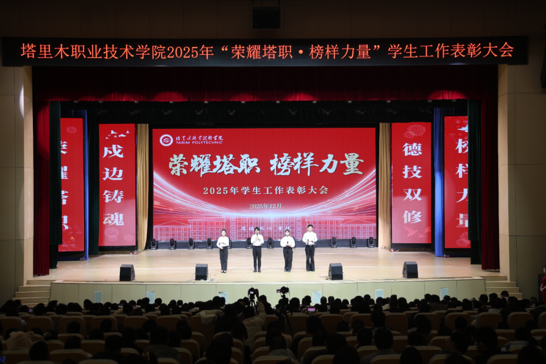 12月24日,塔里木职业技术学院举行“荣耀塔职・榜样力量”2025年学生工作表彰大会。学院党委班子成员、各二级学院党支部书记、相关处室负责人、教师代表及获奖学生代表等700余人参会。