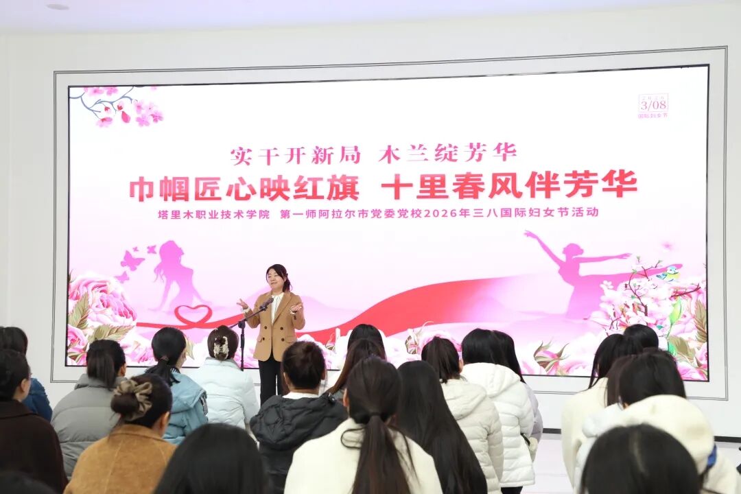 春和景明,芳华绽放。在第116个“三八”国际妇女节到来之际,塔里木职业技术学院联合第一师阿拉尔市党委党校开展“巾帼匠心映红旗 十里春风伴芳华”主题庆祝活动,两校女同胞欢聚一堂共庆佳节,在温馨美好的氛围中展现新时代女性的巾帼风采。塔里木职业技术学院党委书记曾晓,师市党委党校(行政学院)副校(院)长霍佳佳,塔里木职业技术学院党委委员、副院长、妇联主席茹克亚木・如斯坦木出席活动。