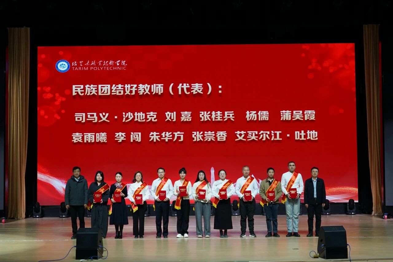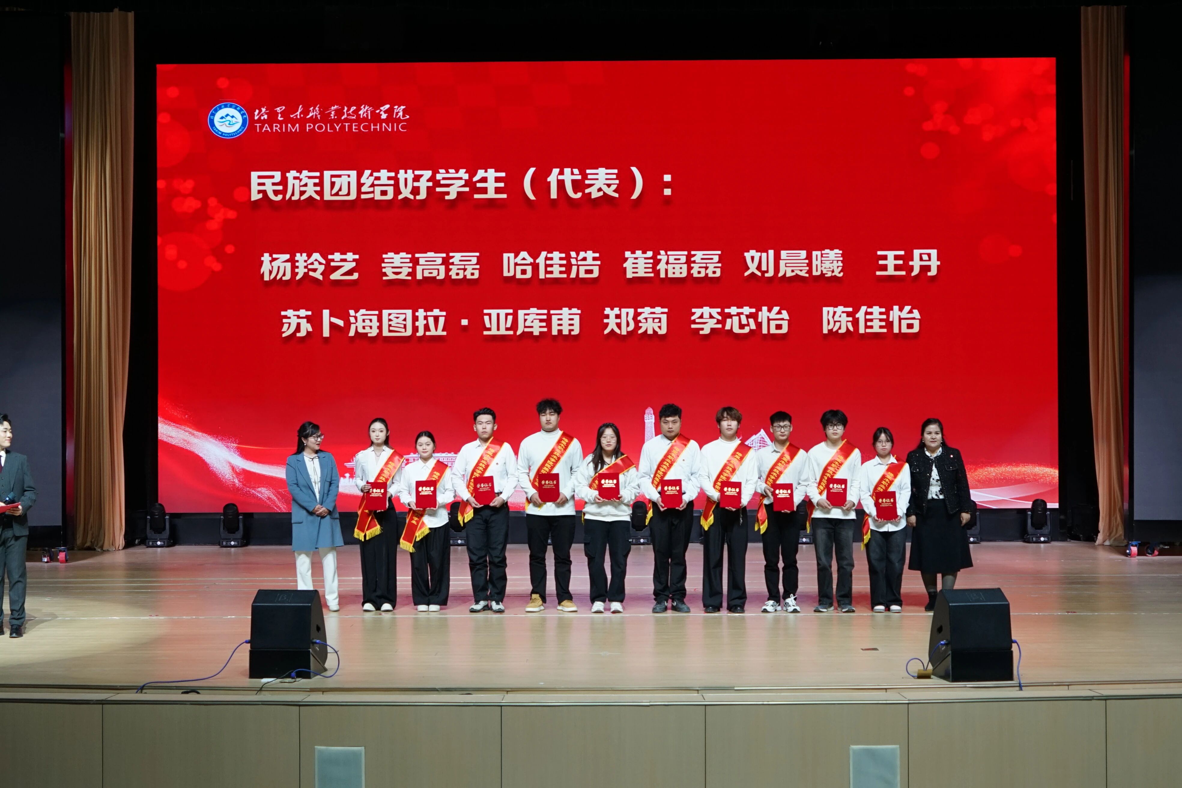 表扬环节成为整场活动的高潮。学院党委委员、副院长茹克亚木・如斯坦木宣读表彰决定后,“民族团结好学生” 代表杨羚艺、姜高磊等 10 名同学,“民族团结好教师” 司马义・沙地克、刘嘉等 10 名教师,以及组织(宣传)部、学生工作部等 5 个 “民族团结进步模范集体” 依次上台领奖,接受表扬。