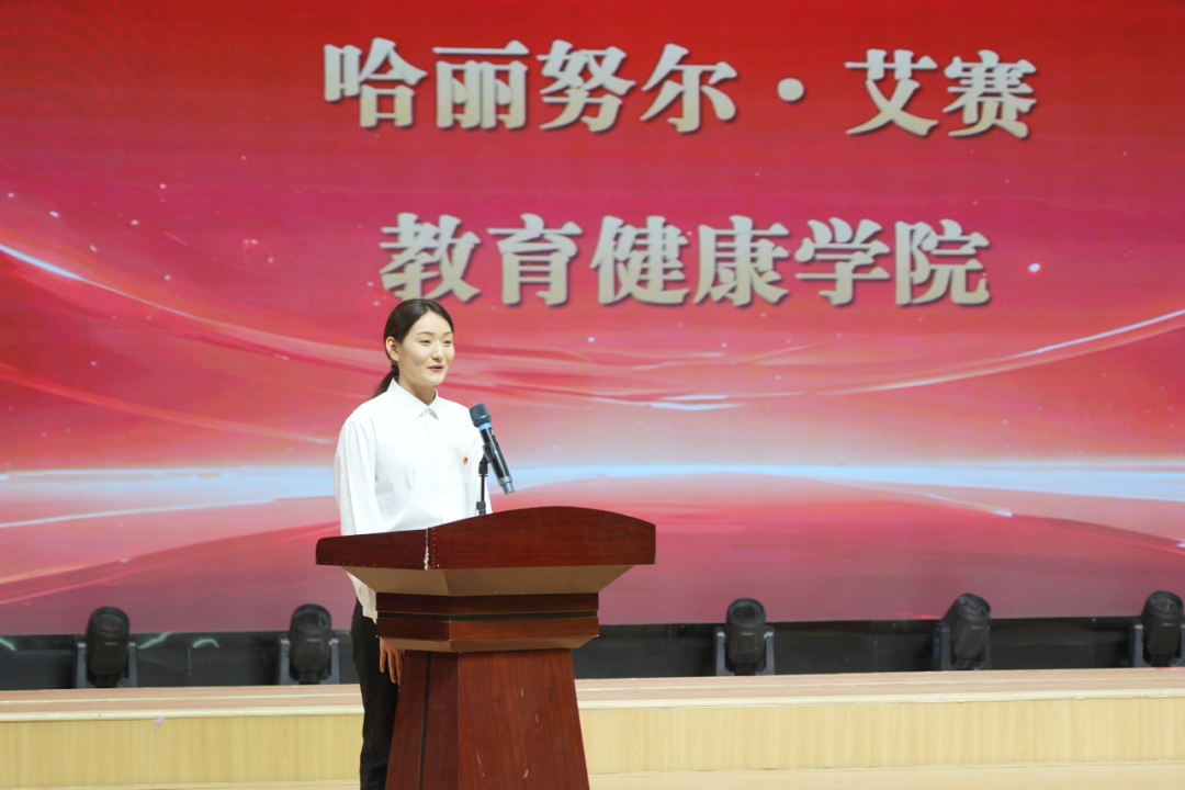 优秀学生代表、国家励志奖学金获得者、新疆自治区职业院校技能大赛获奖学生哈丽努尔・艾塞,以“工匠打磨器物”为喻,讲述了自己在学院“厚德・同心・重技”校训指引下,通过脚踏实地的练习、无惧荆棘的挑战和心怀感恩的坚持,实现自我蜕变、收获成长硕果的故事。