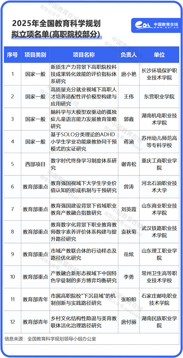 8月5日,全国教育科学规划领导小组办公室发布《2025年度全国教育科学规划拟立项名单公示》。共540个项目拟获立项资助,其中包括12所高职院校申报的12个项目。
